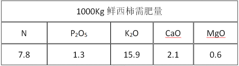 每生产1000千克番茄需从土壤中吸收氮7.8千克、P2O5 1.3千克、K2O 15.9千克、 CaO 2.1千克、MgO 0.6千克。